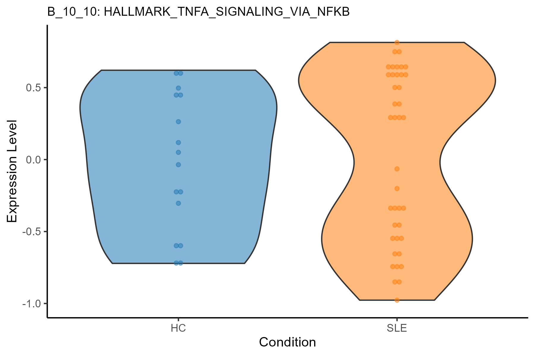 | B_10_10: HALLMARK_TNFA_SIGNALING_VIA_NFKB | 0.0612858893481772 | 0.823538593928206 | B | SLE | |
